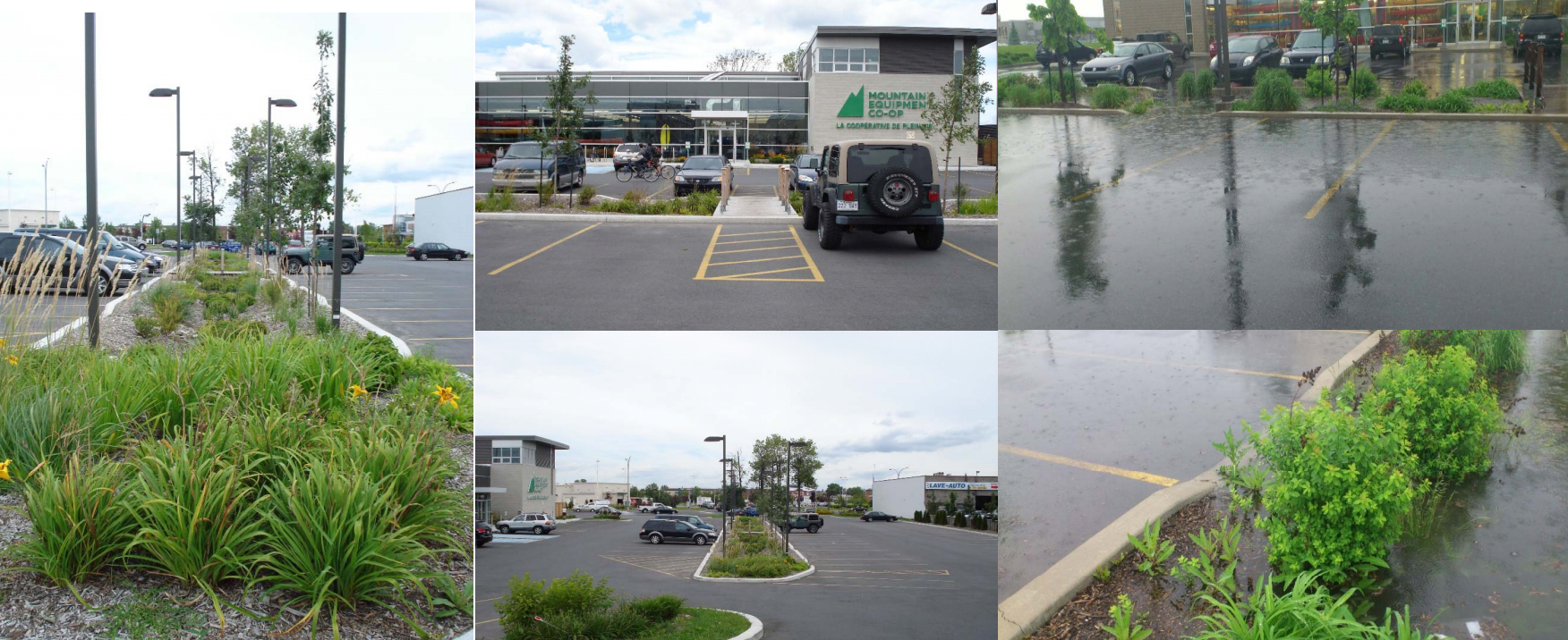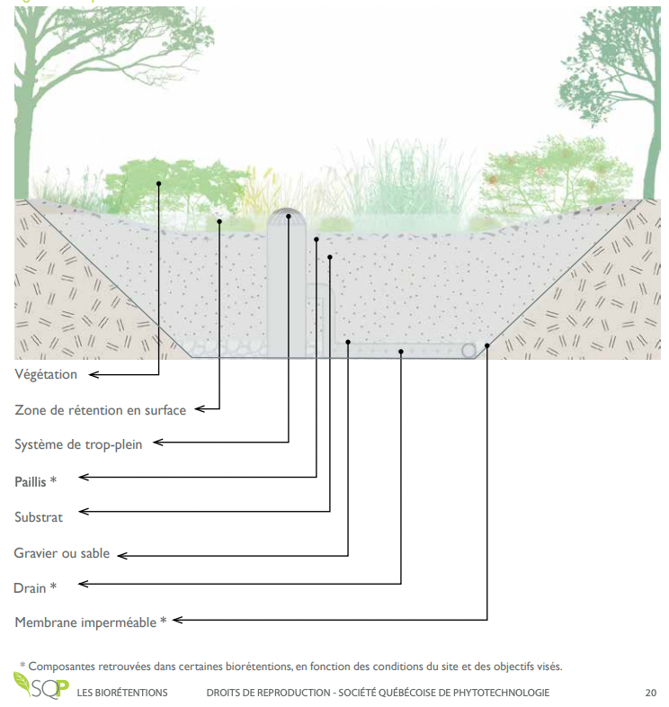 - Des ouvrages qui sont conçus pour reproduire le plus fidèlement possible les conditions hydrologiques naturelles en maximisant l’infiltration, le stockage et la relâche lente des eaux de ruissellement.